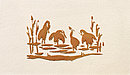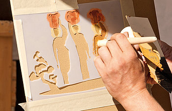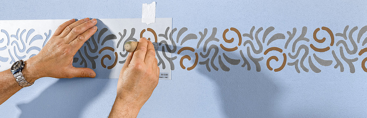Der Pinsel wird rechtwinklig zur Fläche gehalten. Dieser Vorgang wird so lange wiederholt, bis das Muster der Schablone gut gedeckt auf dem Untergrund sichtbar ist. Anschließend wird die Schablone vorsichtig abgenommen und kann nach Reinigung und Trocknung wieder verwendet werden.