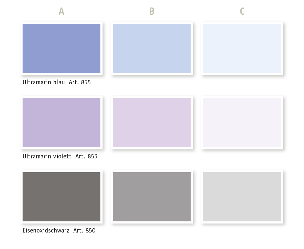Wir möchten darauf hinweisen, dass die Farbtöne durch verschiedene Monitore und deren Einstellungen nicht immer korrekt dargestellt werden können. Gleiches gilt auch für selbst erstellte Ausdrucke dieser Farbtöne. Um einen besseren, bzw. originalgetreuen Eindruck von unseren Farben zu bekommen, empfehlen wir den Erwerb unseres Farbfächers, unserer Farbkarten mit original-Aufstrichen oder unsere gedruckten, kostenlosen Flyer.